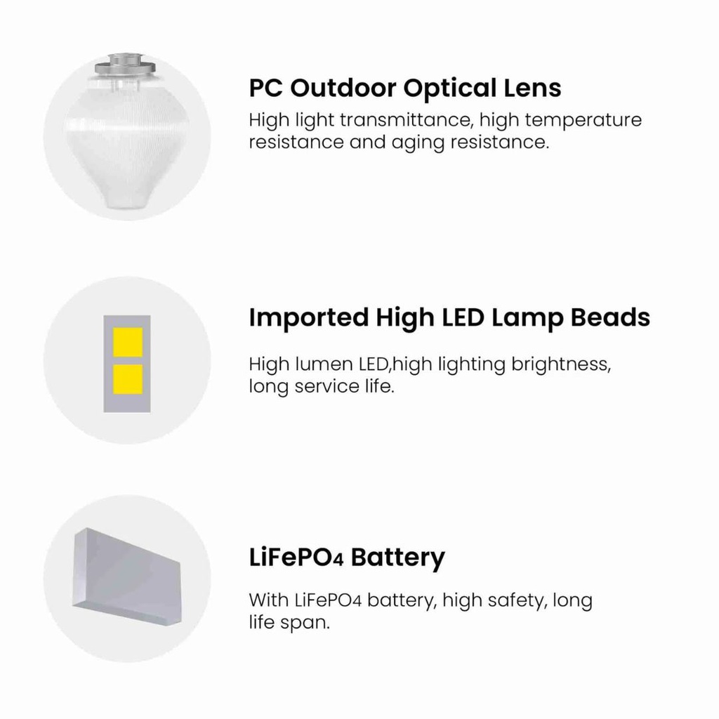 The built-in 3.2V/26Ah LiFePO4 battery guarantees a long working time of ≥12 hours, providing bright illumination throughout the night.